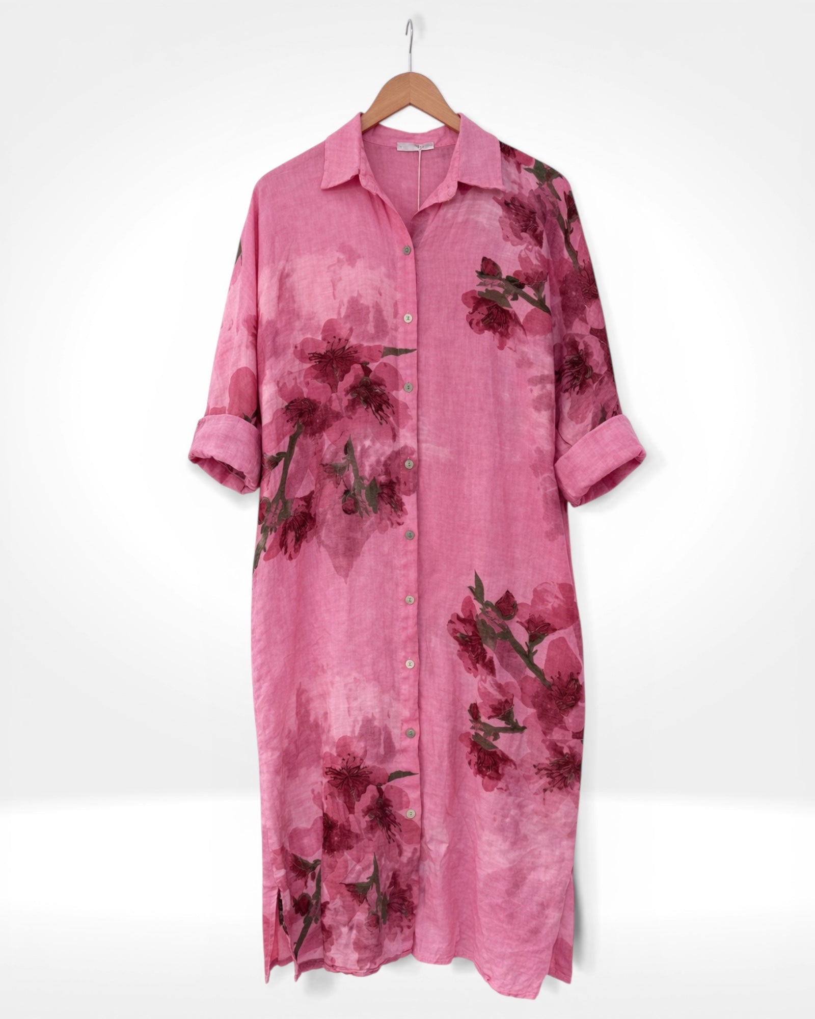 Made from 100% breathable linen, this relaxed-fit shirt dress features a beautiful oversized floral print, button-down front, and practical side pockets. Designed with adjustable sleeves that can be worn rolled up or down, it’s a versatile and comfortable piece perfect for effortless everyday style.