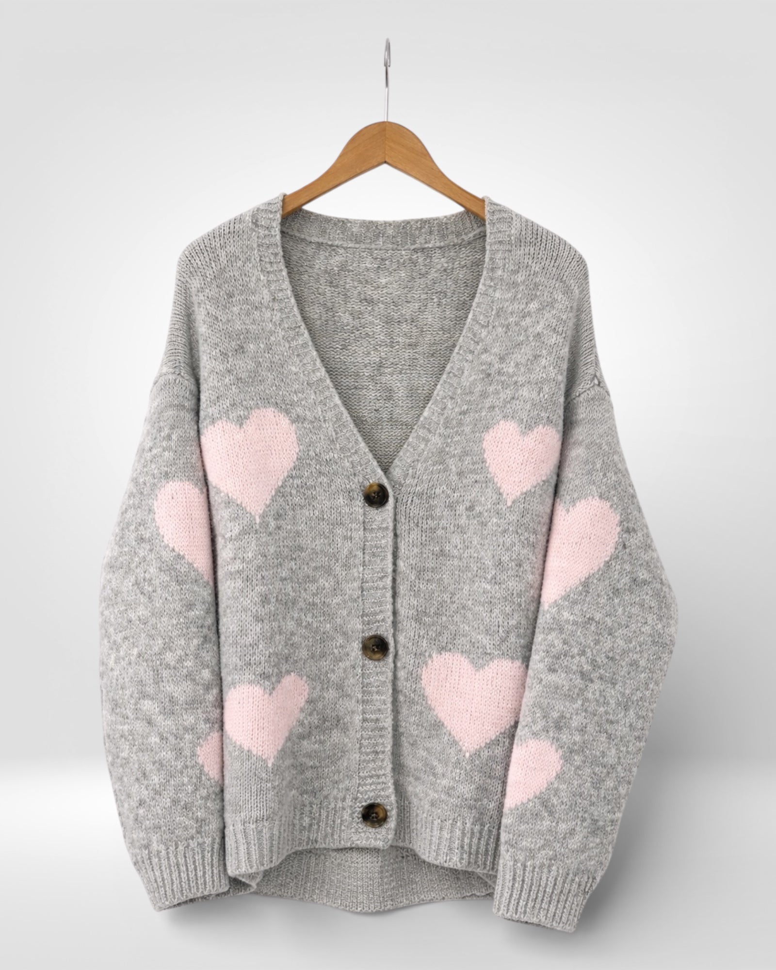 A soft, cosy cardigan featuring a relaxed fit and delicate heart detailing throughout. Designed with a flattering V-neckline, button-front closure, and ribbed trims, this knit is perfect for effortless layering and everyday wear with a touch of charm.