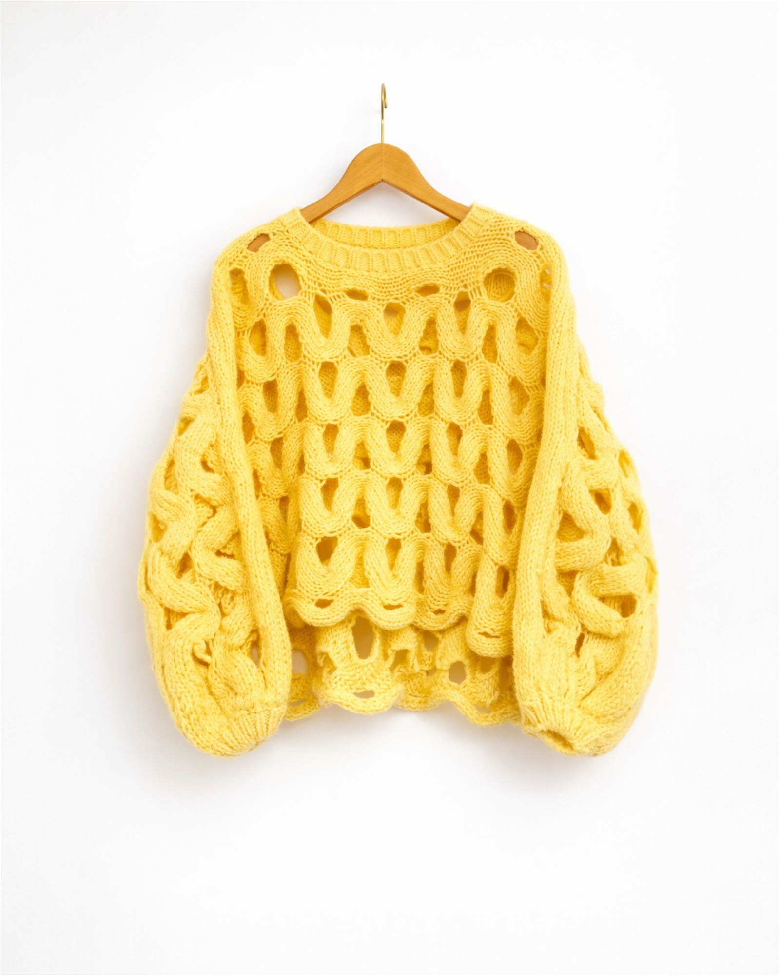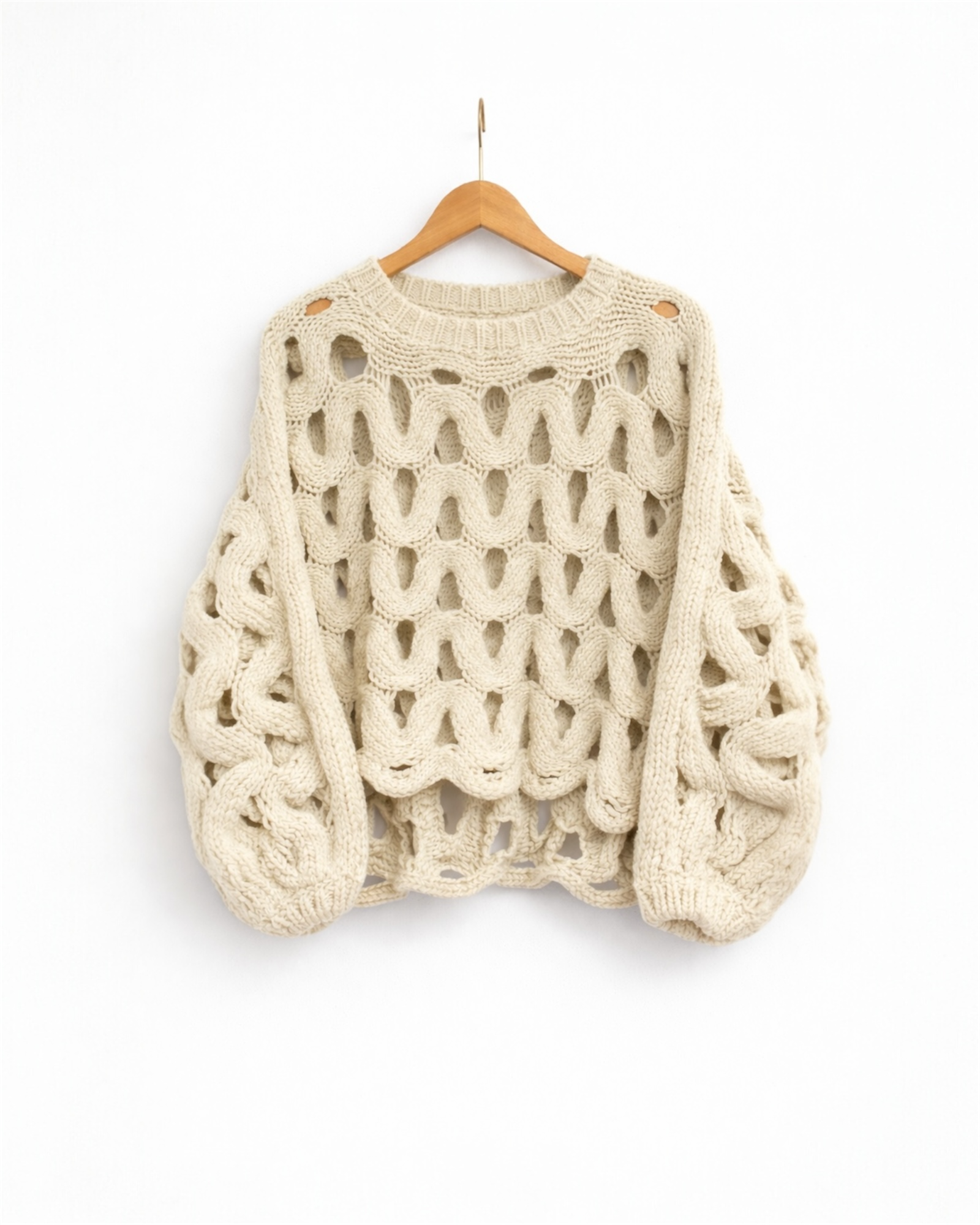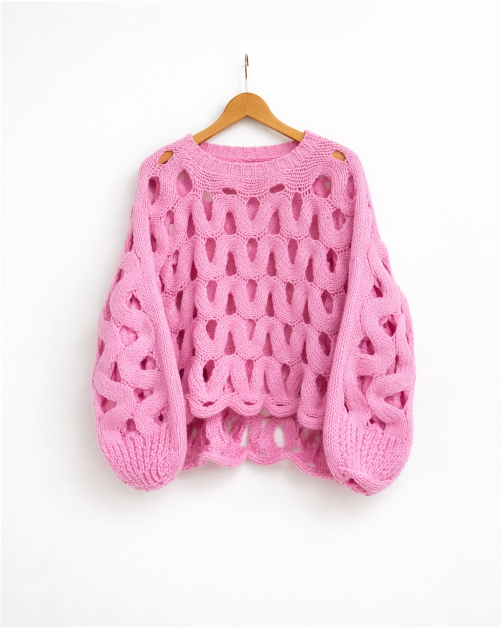 Turn heads with the Open-Weave Statement Sweater — a bold, artisanal knit featuring dramatic oversized loops and a rich wine-red hue. This airy, sculptural design adds instant texture and intrigue to any outfit, perfect for layering over camis, fitted tops, or dresses. A true standout piece for those who love expressive, fashion-forward style.