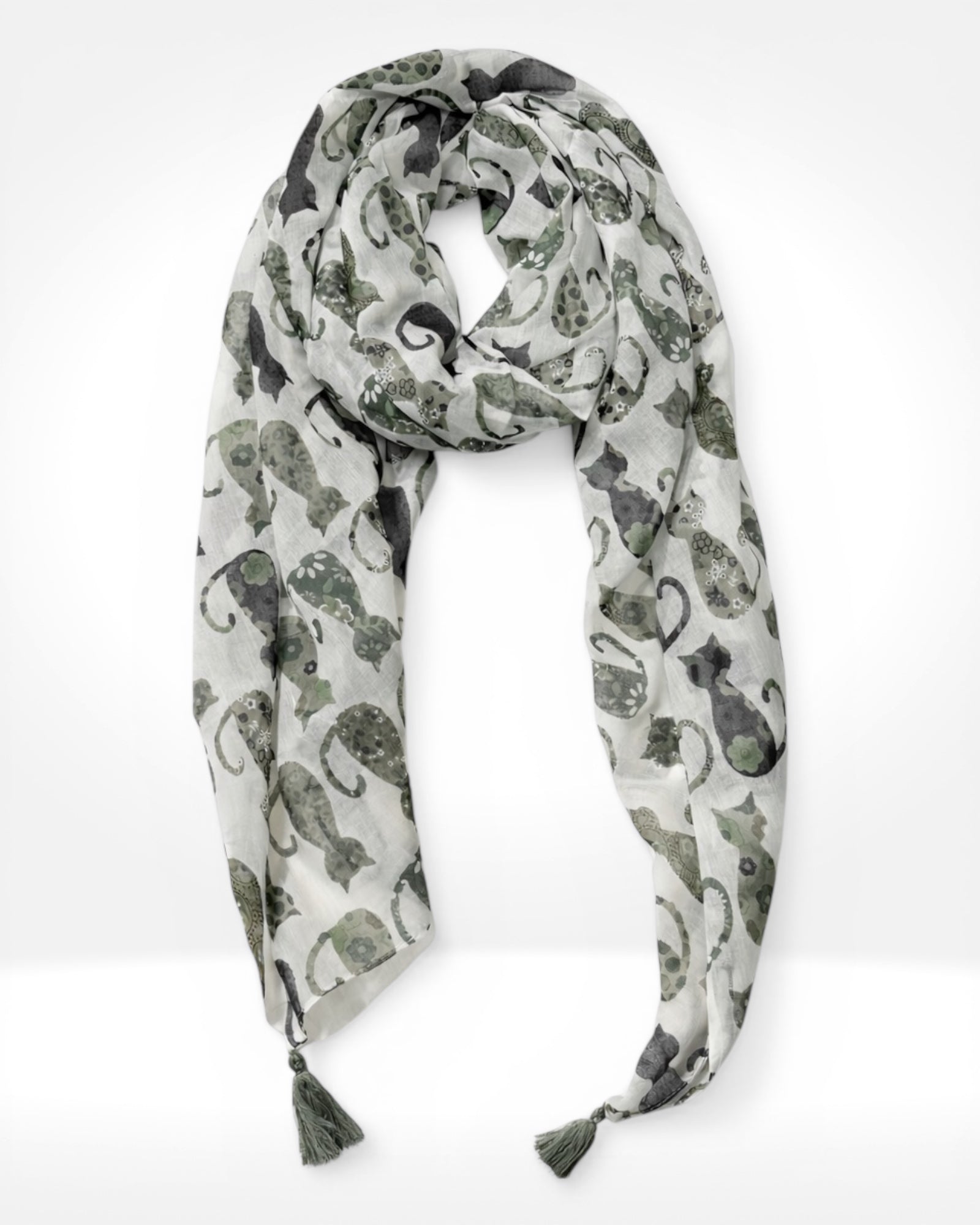 A lightweight scarf featuring a playful cat print in soft green and grey tones. Finished with tassel details, it’s a fun and stylish accessory that adds personality to any outfit.