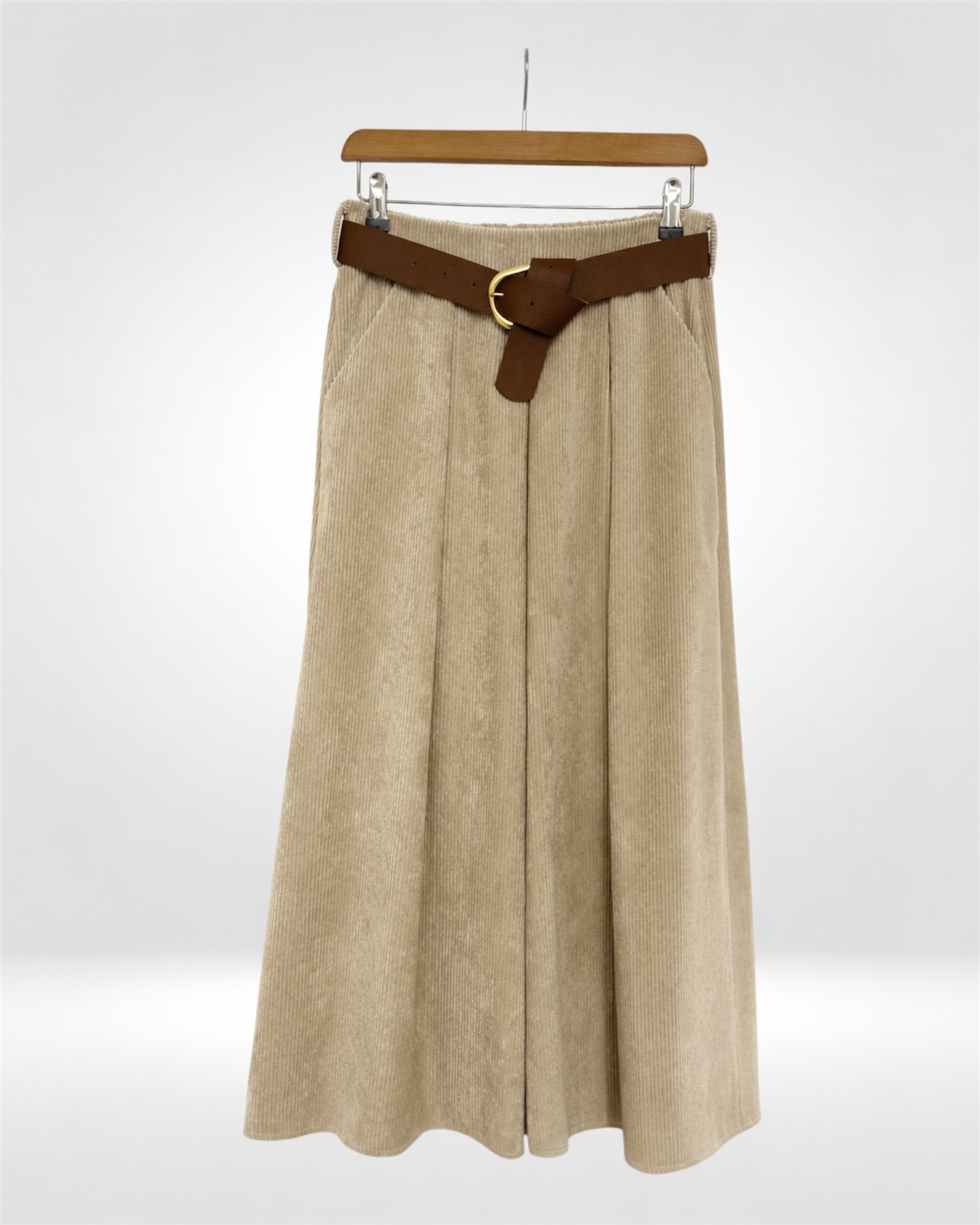 A beautiful corduroy midi skirt designed with soft structure and elegant movement. Featuring a flattering high waist, gentle pleats, and a timeless silhouette, this piece transitions effortlessly from everyday styling to refined seasonal looks.