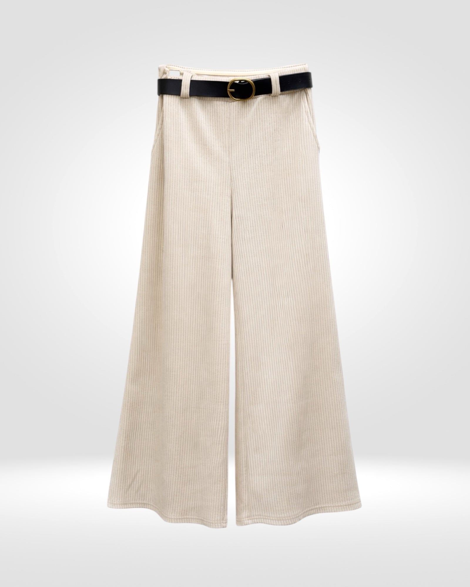 Soft ribbed wide-leg trousers designed with a flattering high waist and clean, flowing silhouette. Finished with a contrast belt detail, they offer effortless comfort and timeless elegance for everyday or elevated styling.