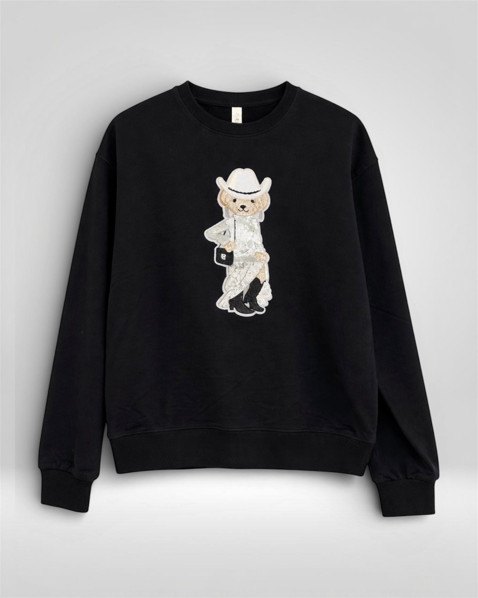 Meet your new statement sweatshirt! This cozy black crewneck features an adorable cowgirl bear decked out in sparkly details that catch the light just right. Soft, comfy, and effortlessly cute—perfect for dressing up your everyday denim or lounging in style.