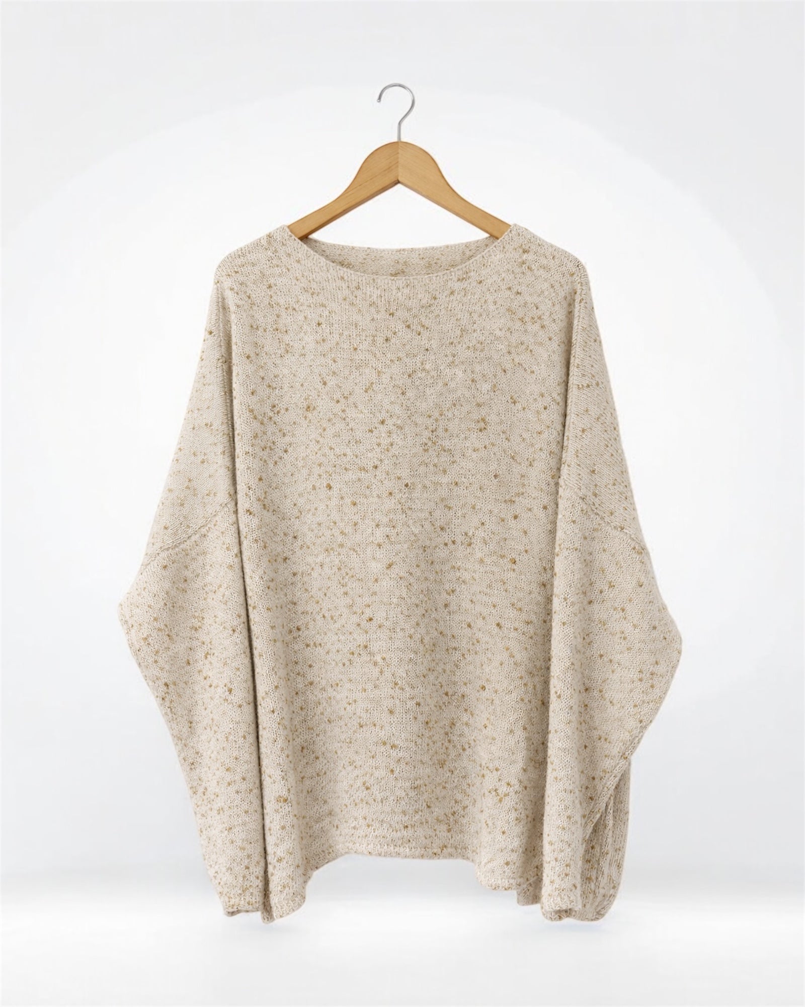 A beautifully soft fine-knit jumper woven with delicate gold thread for a subtle shimmer. Designed with a relaxed silhouette and effortless drape, this piece adds a touch of understated luxury to everyday dressing. Perfect for elevating denim or layering with tailored separates.