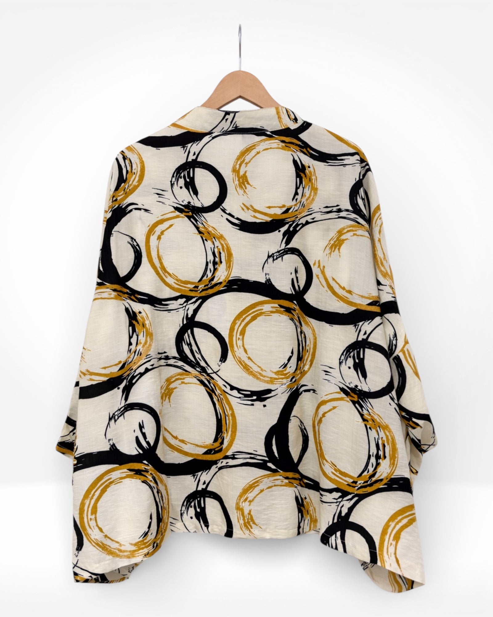 A lightweight, flowy blouse featuring bold abstract circular brushstrokes in black and warm golden tones on a soft cream base. Designed with a relaxed silhouette, button-down front, and subtle drape for effortless elegance and modern versatility.