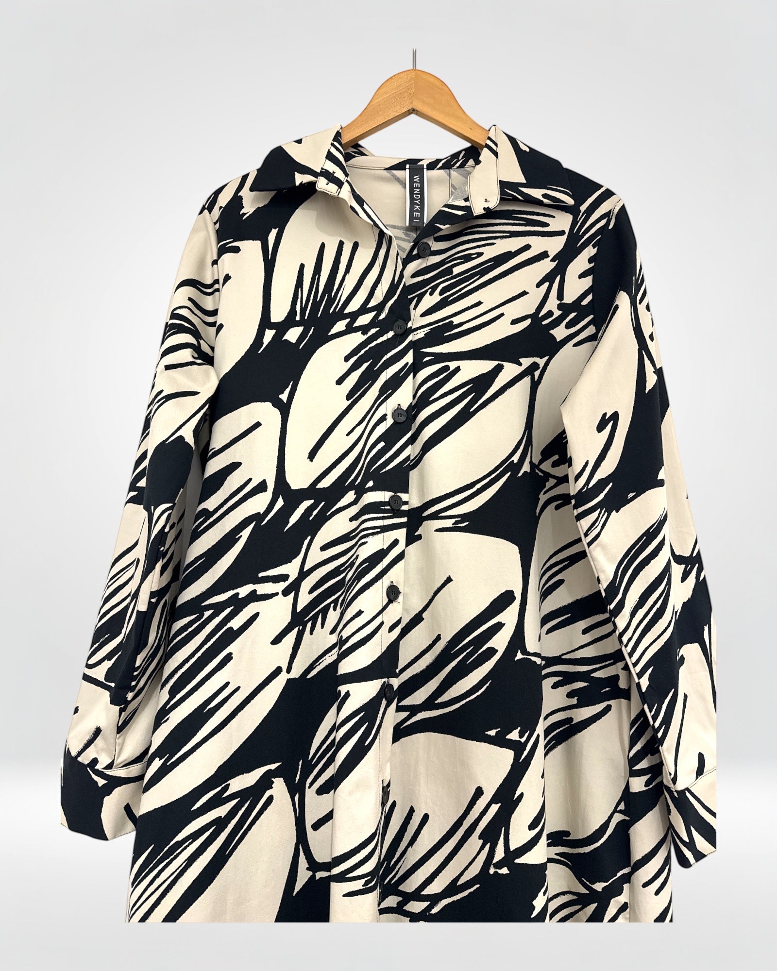 A statement shirt dress with an artistic edge. Crafted from breathable cotton, the Ink Drift features a flowing silhouette, button-down front, and bold brushstroke print that moves effortlessly from day to night. Relaxed yet refined, it’s designed for modern dressing with a creative twist.
