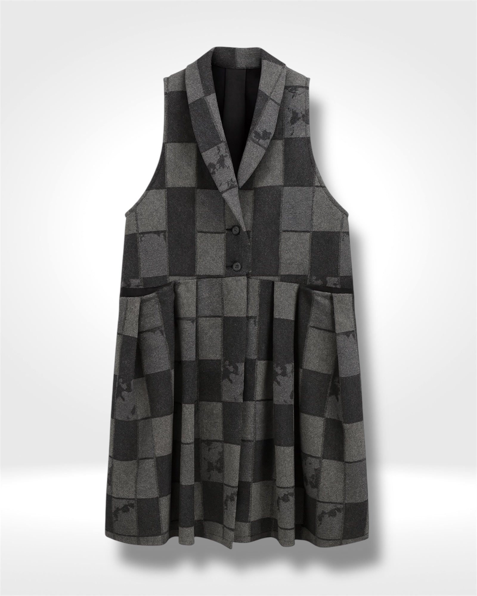 A sleeveless, Italian-made wool coat featuring a soft, structured silhouette with a grey checkered pattern. Designed with a notched lapel, front buttons, and subtle pleating for added shape. Warm, elegant, and perfect for refined everyday wear.