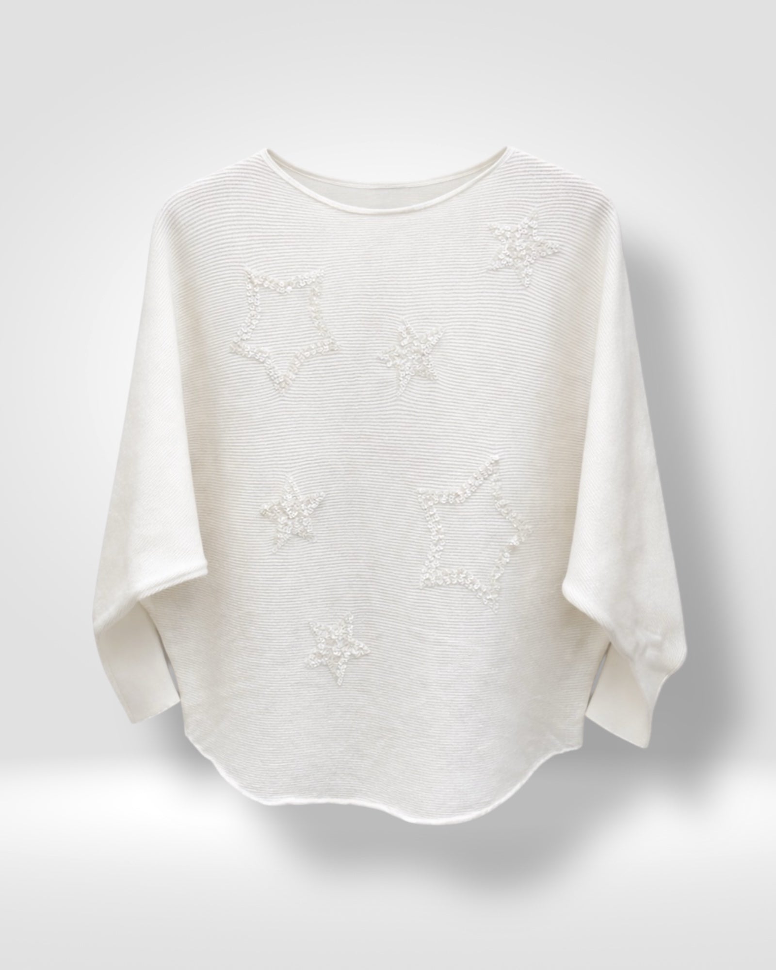 A soft, lightweight knit top adorned with delicate beaded star detailing. Designed with a relaxed batwing silhouette and subtle ribbed texture, it brings effortless elegance and a touch of sparkle to everyday dressing.