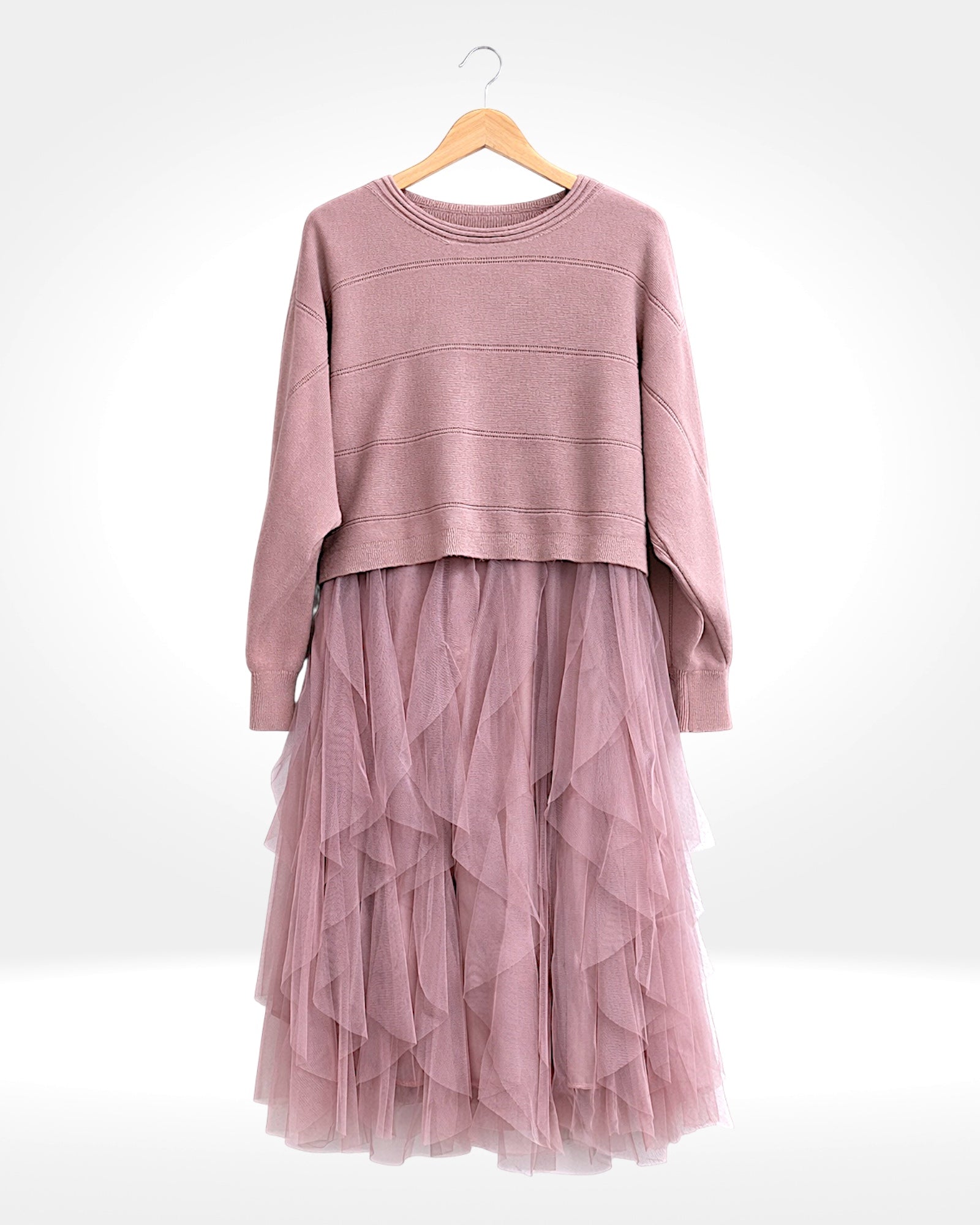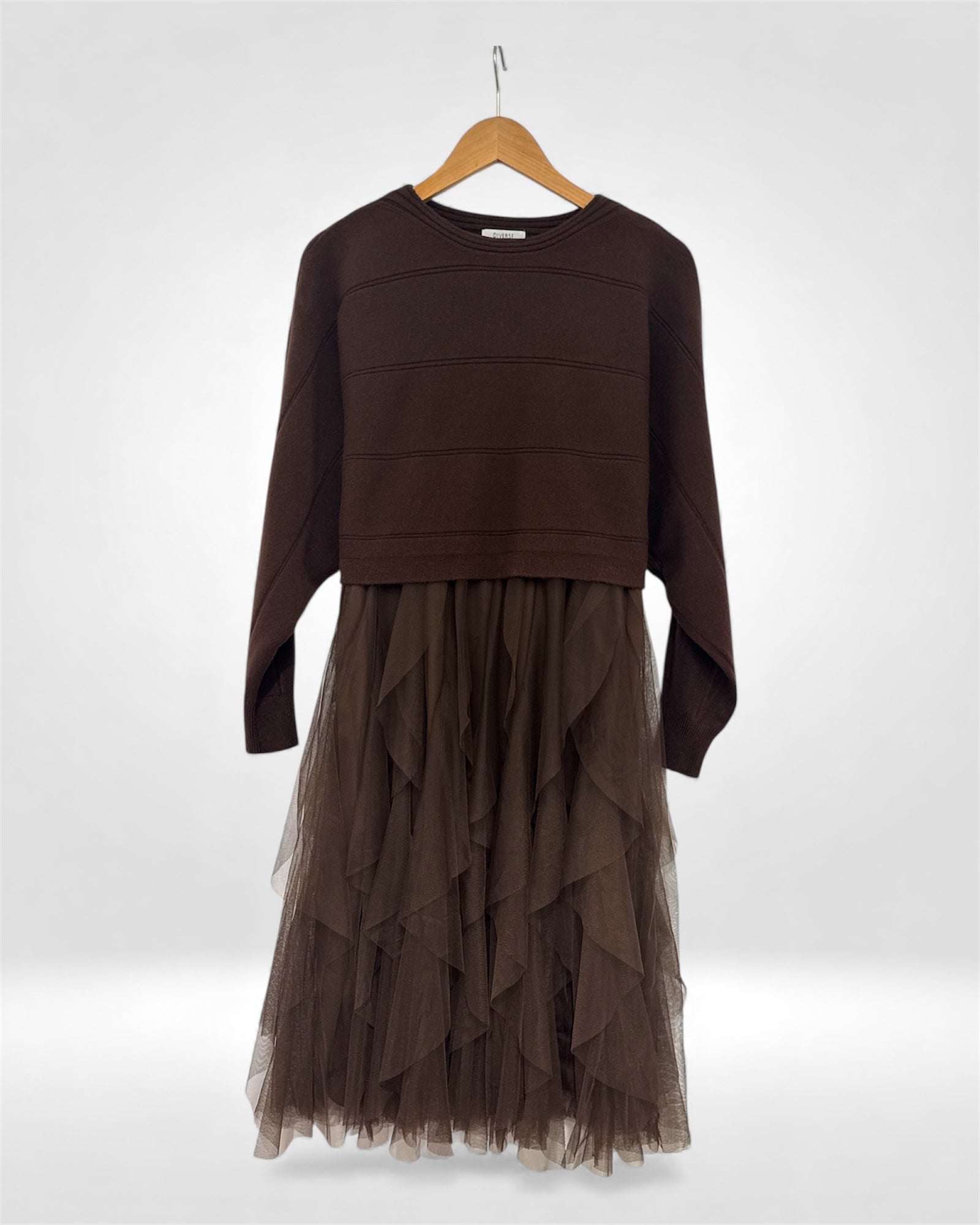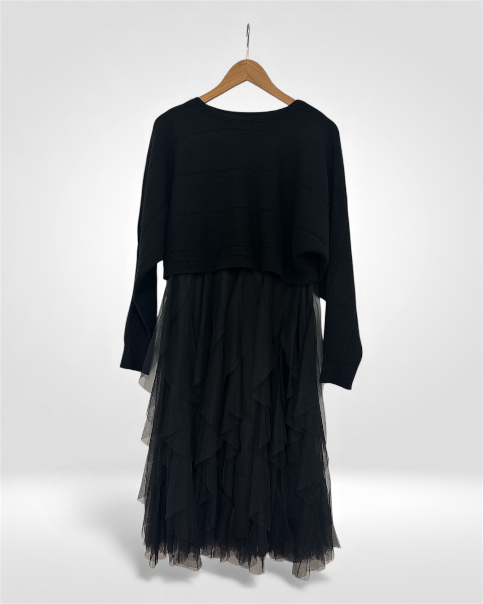 The Knit & Float Duo blends comfort and elegance with a soft cropped knit jumper layered over a flowing, tiered tulle dress. Effortlessly stylish and beautifully textured, this two-piece set creates a dreamy, modern silhouette perfect for dressed-up days or chic casual evenings.