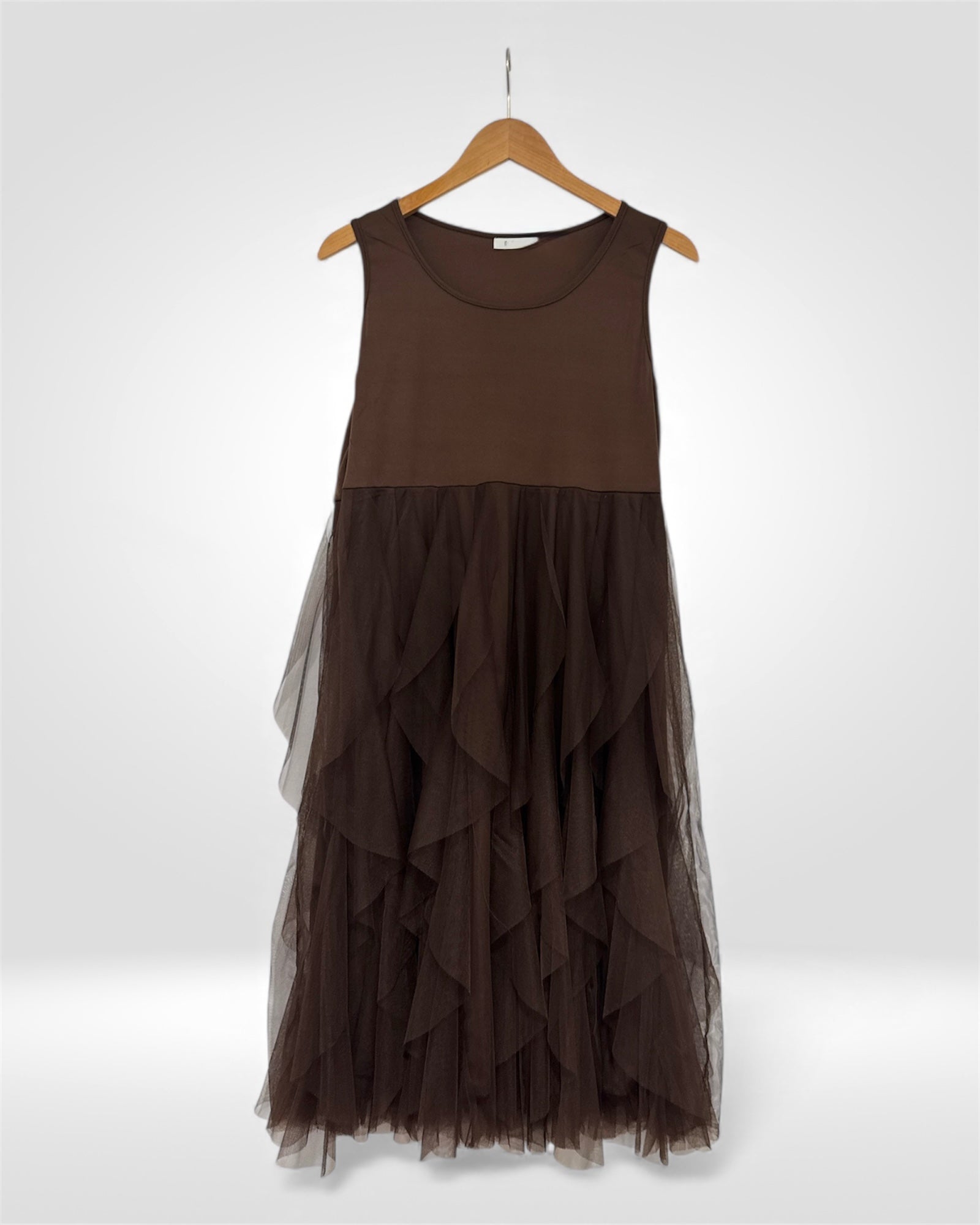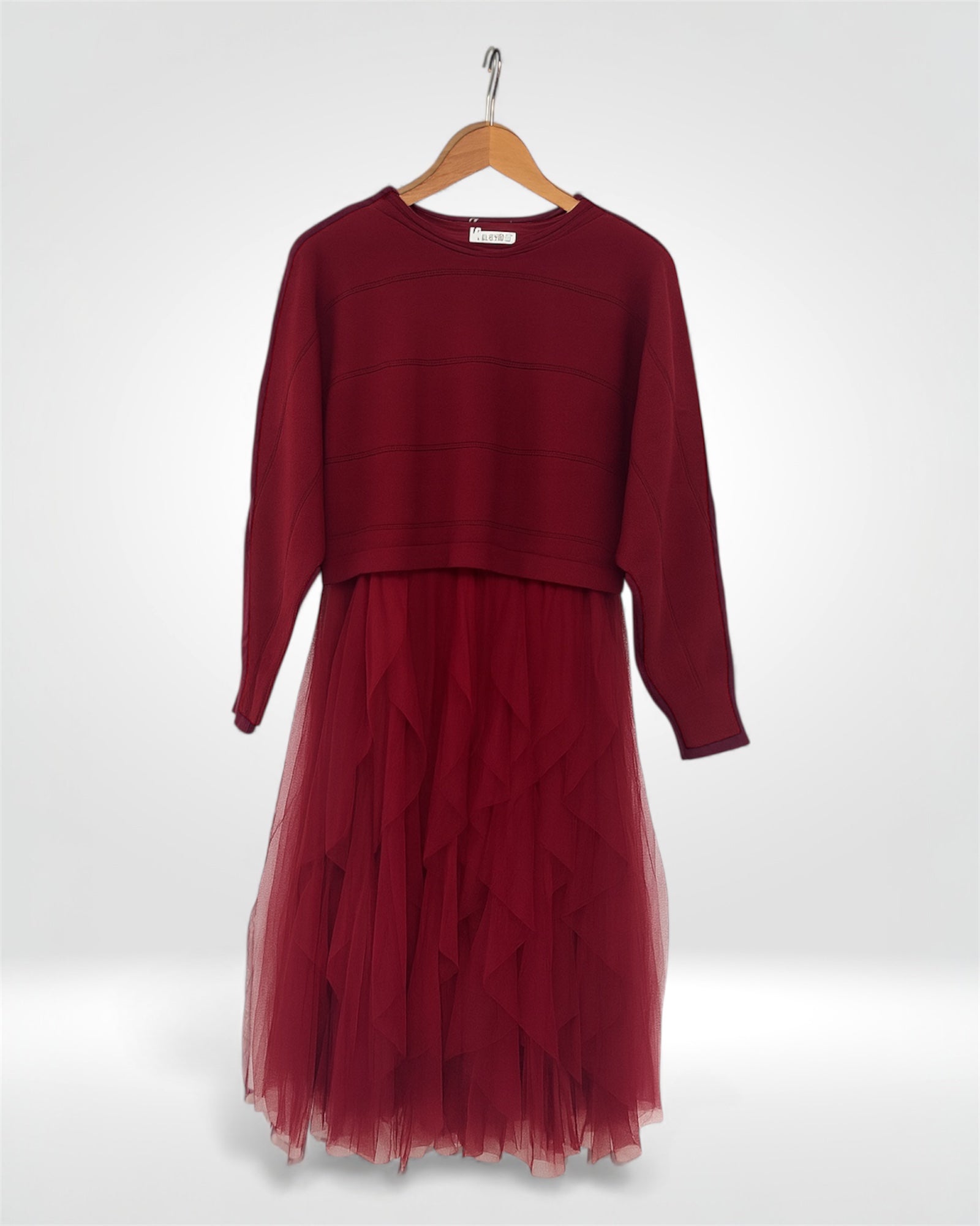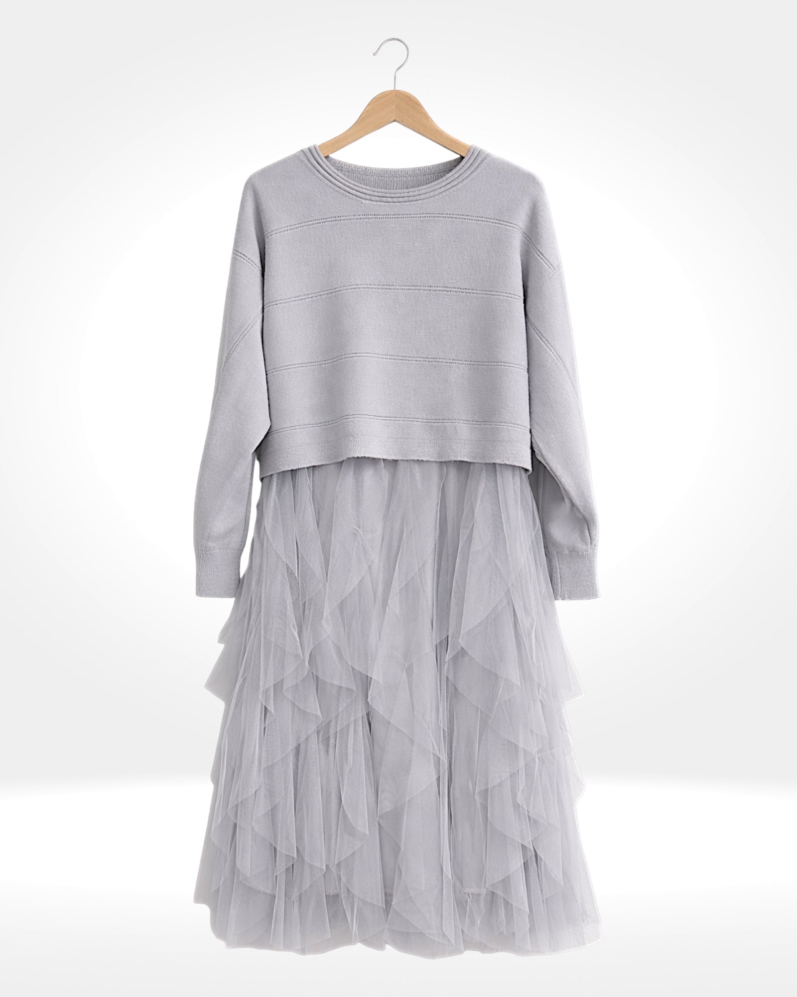 The Knit & Float Duo blends comfort and elegance with a soft cropped knit jumper layered over a flowing, tiered tulle dress. Effortlessly stylish and beautifully textured, this two-piece set creates a dreamy, modern silhouette perfect for dressed-up days or chic casual evenings.