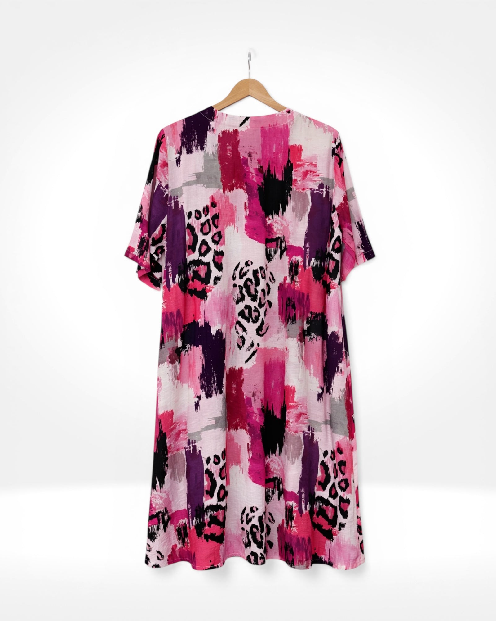 A flowing dress featuring the expressive Leopard Brushstroke print. The relaxed silhouette and soft movement create an easy, flattering fit while the mix of abstract brushstrokes and leopard spots adds a playful statement.
