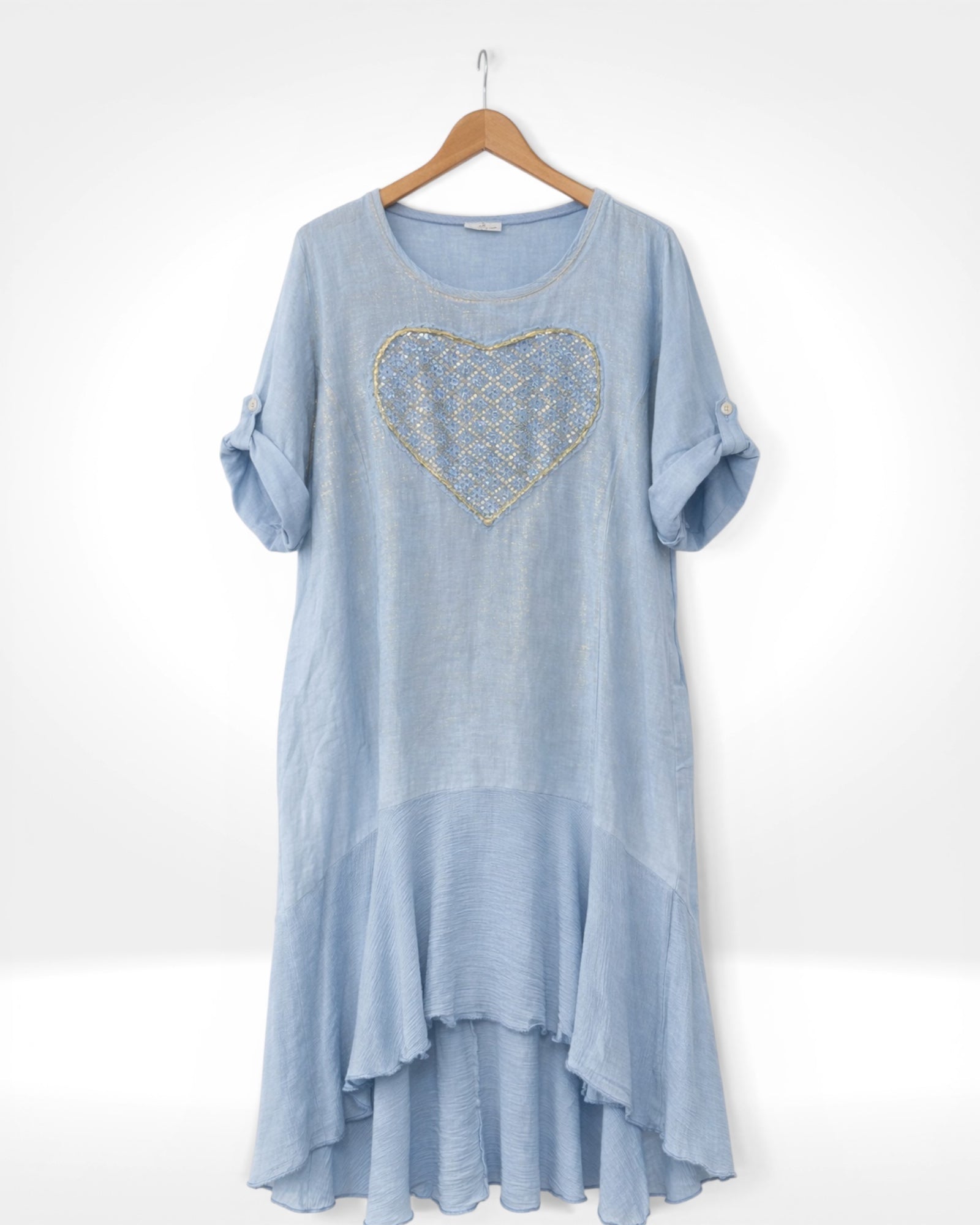 Made from 100% breathable linen, this relaxed-fit dress features a sparkling sequin heart detail, roll-up sleeves, side pockets, and a flattering hi-low hem. Lightweight and comfortable, it’s perfect for effortless everyday style with a touch of shimmer.