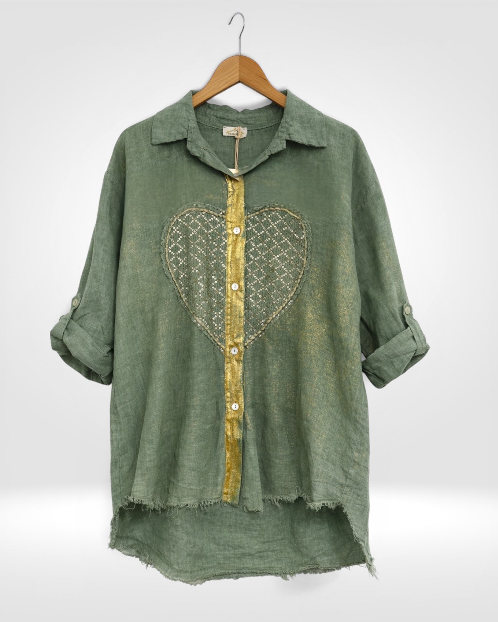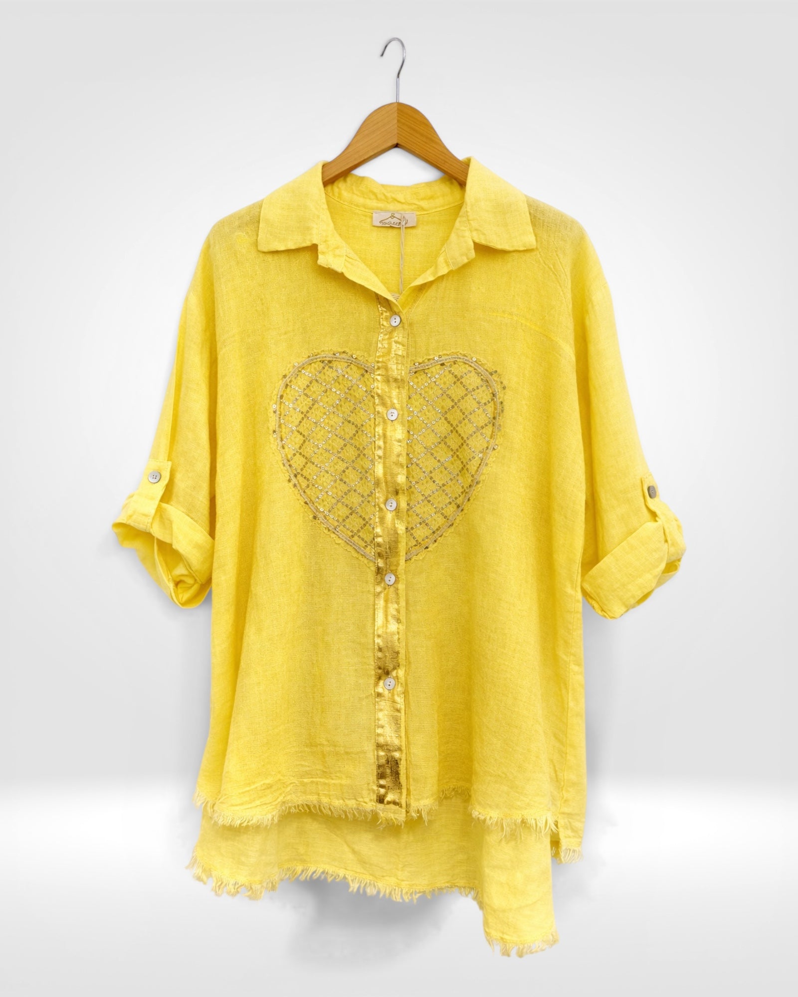 Made from 100% breathable linen, this relaxed-fit shirt features a shimmering sequin heart detail, button-down front, and roll-up sleeves. Finished with a soft frayed hem and lightweight feel, it’s perfect for effortless everyday style with a subtle touch of sparkle.