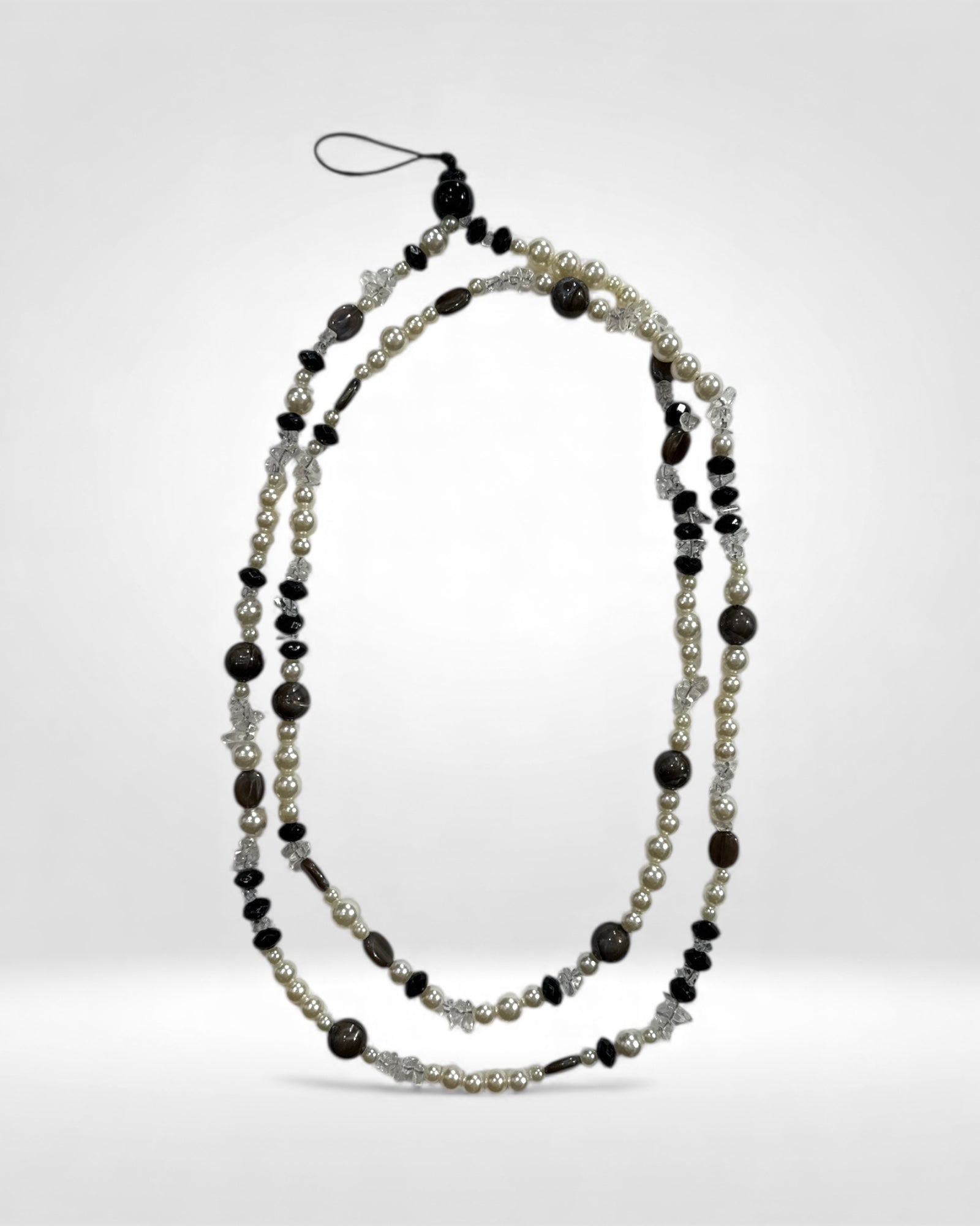 Elevate your style with this handcrafted beaded necklace, featuring a captivating blend of lustrous pearls, glossy black beads, and earthy marbled accents. Its elongated, versatile design makes it perfect for layering or wearing as a statement piece. A chic addition to both everyday and evening looks.
