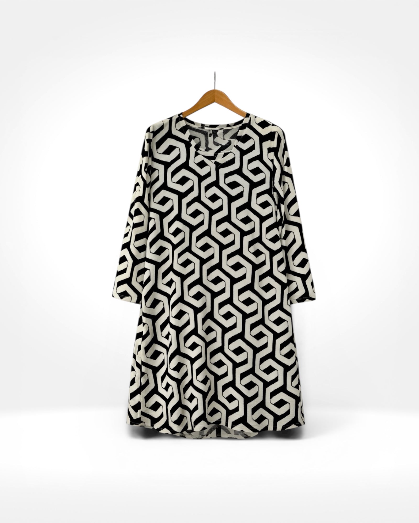 A stylish monochrome tunic dress featuring a bold geometric print and relaxed silhouette. Designed with a soft drape and comfortable fit, making it an easy statement piece for everyday wear. Perfect paired with leggings, trousers, or worn on its own.