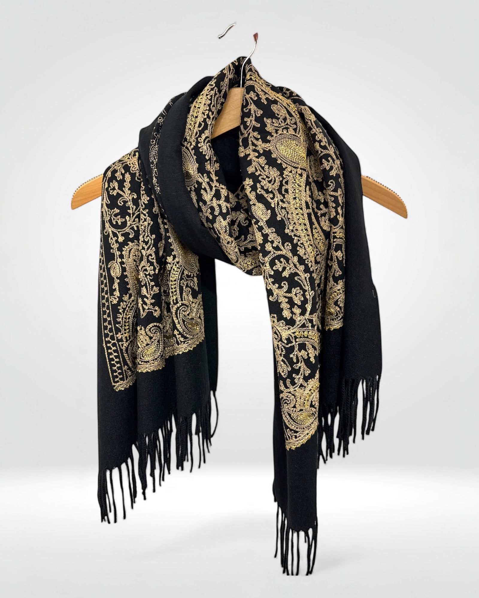 Elevate any outfit with this stunning black scarf adorned in intricate gold paisley embroidery. Its ideal weight and generous size make it perfect as a cozy pashmina, chic evening wrap, or everyday statement piece.
