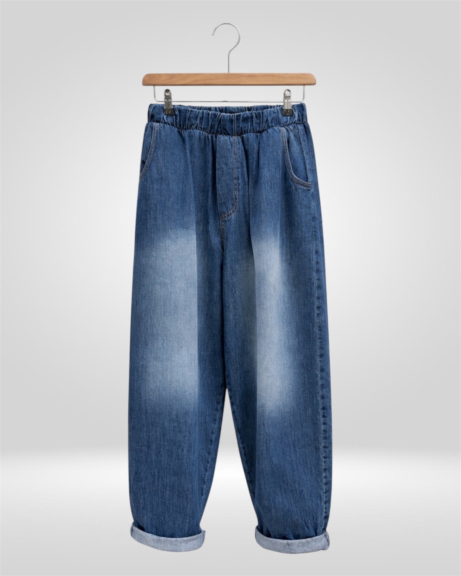 Comfort meets everyday style with these relaxed-fit denim pants. Designed with a soft elastic waistband and lightweight denim, they offer an easy pull-on fit while maintaining a clean, modern look—perfect for casual wear or laid-back days.