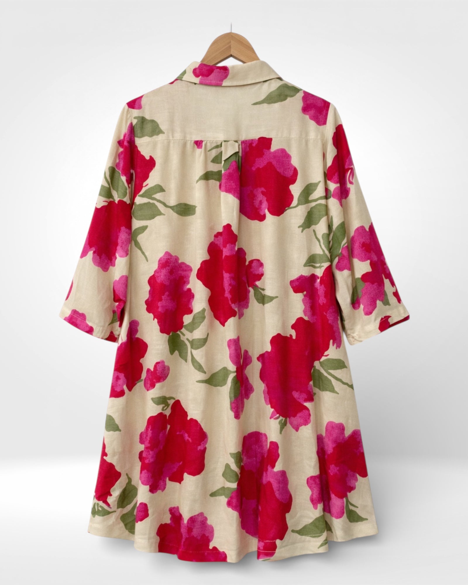 A breezy, button-down shirt dress featuring bold red and pink floral prints on a soft beige base. Designed with a classic collar, relaxed fit, and flowy silhouette, it’s the perfect blend of effortless comfort and vibrant charm for everyday elegance.