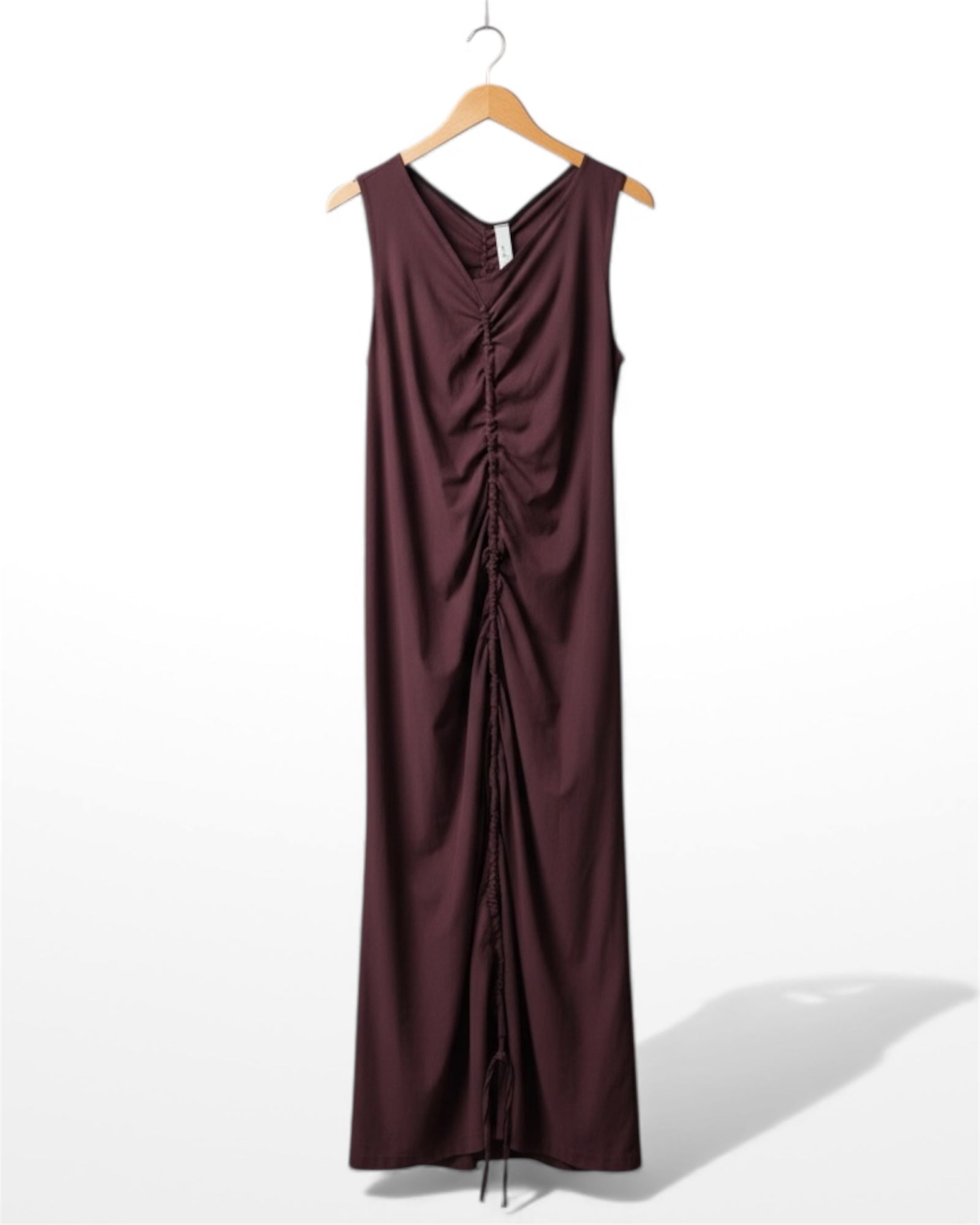 A sleek, sleeveless dress with full-length drawstring ruching for a flattering, modern look. Comfortable, stylish, and perfect for layering or wearing alone.