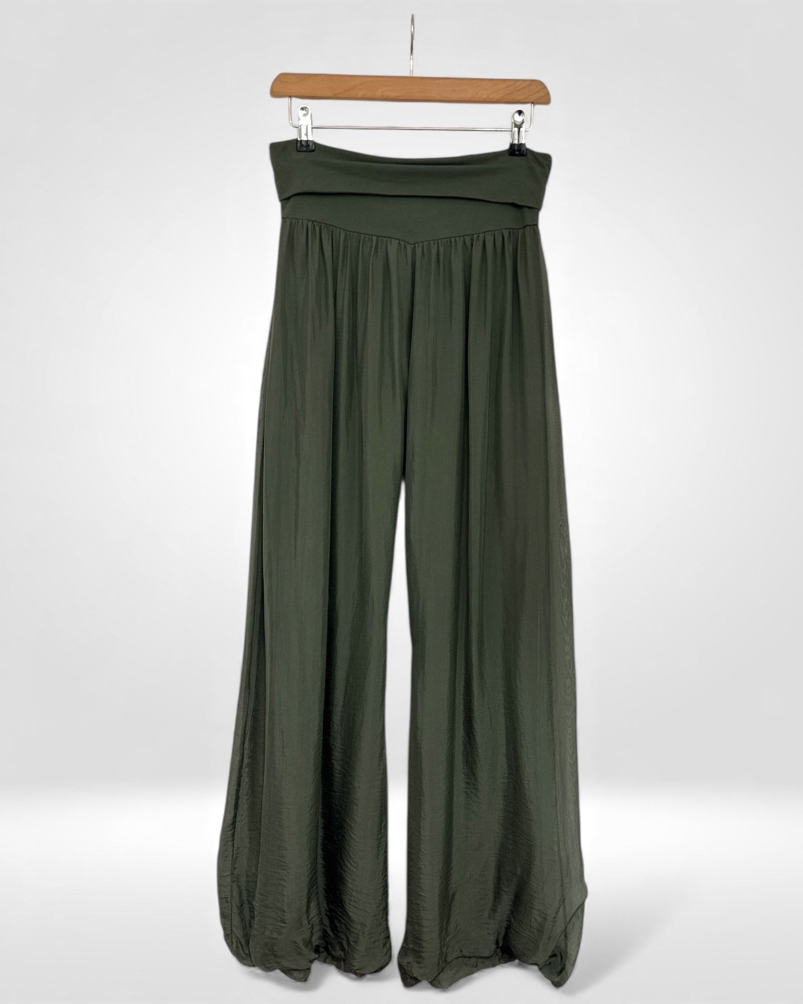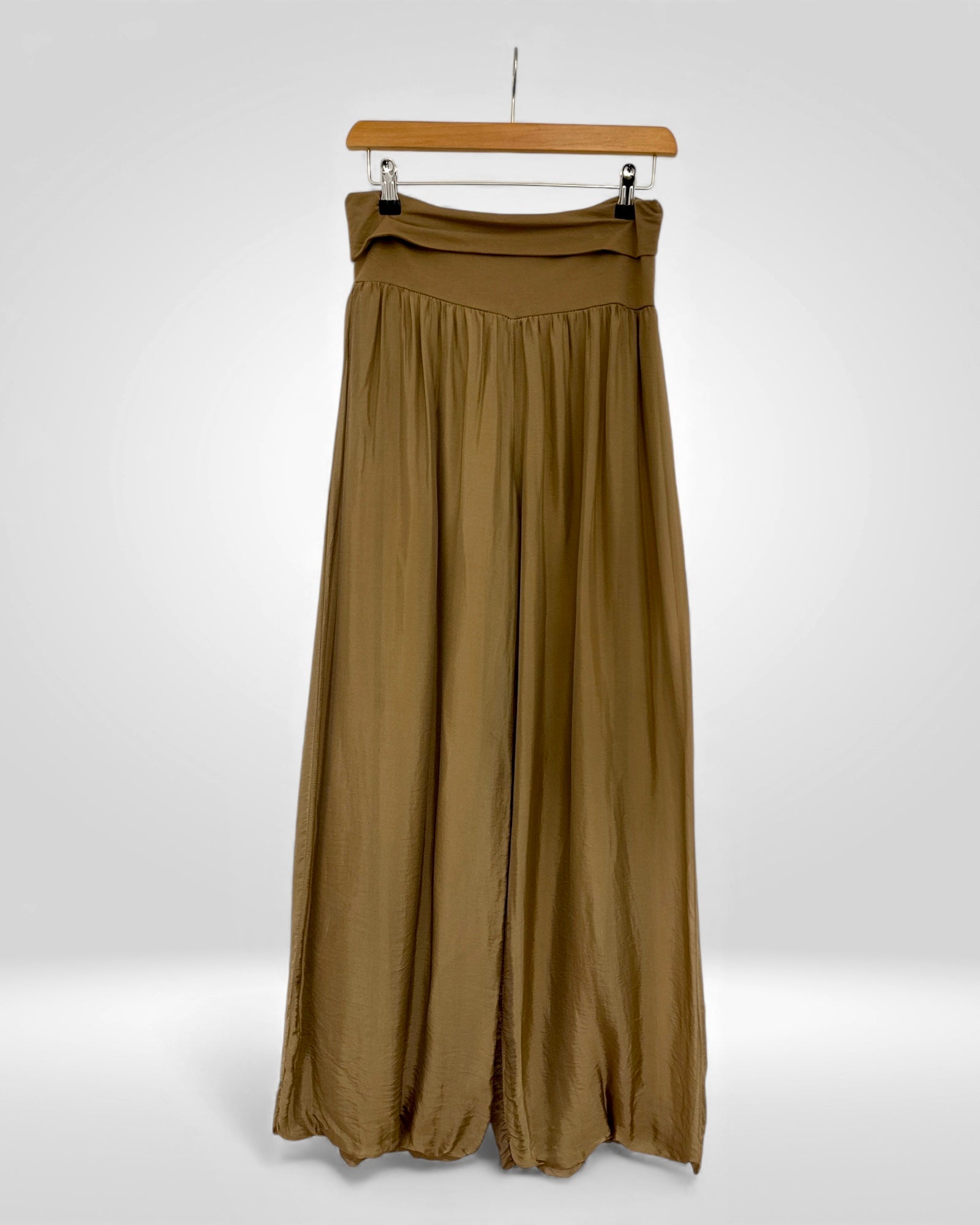 A fluid, wide-leg trouser designed for effortless elegance. Crafted in a lightweight, softly lustrous fabric, this style features a comfortable fold-over waistband and a graceful drape that moves beautifully with the body. An easy yet refined piece, ideal for relaxed daywear or elevated evening styling.