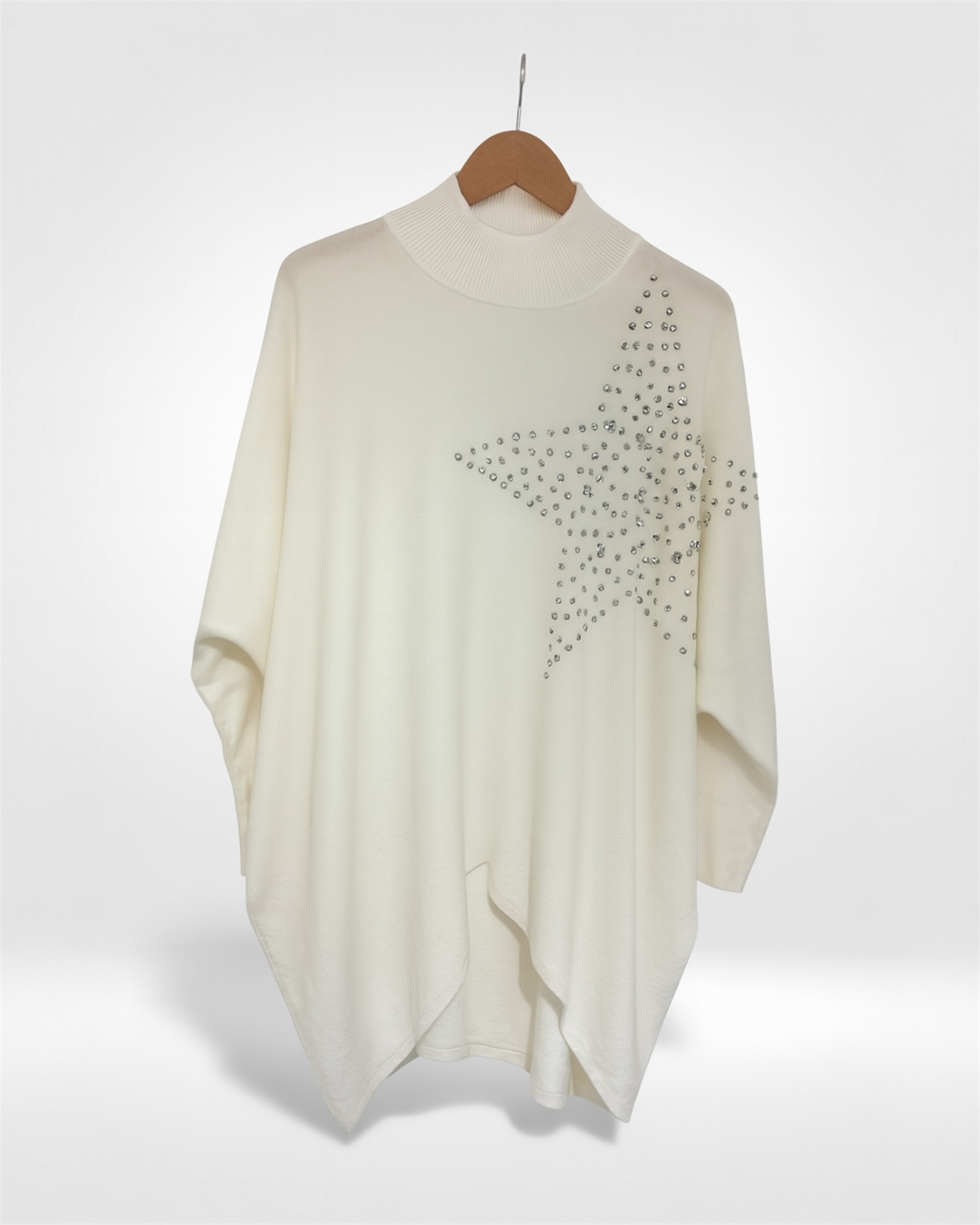 The Starlight Sparkle Knit Jumper features a soft, flowing silhouette accented with a shimmering rhinestone star for effortless chic. Cozy yet stylish, this easy-fit design adds a touch of glam to everyday outfits while keeping you comfortable and beautifully layered.