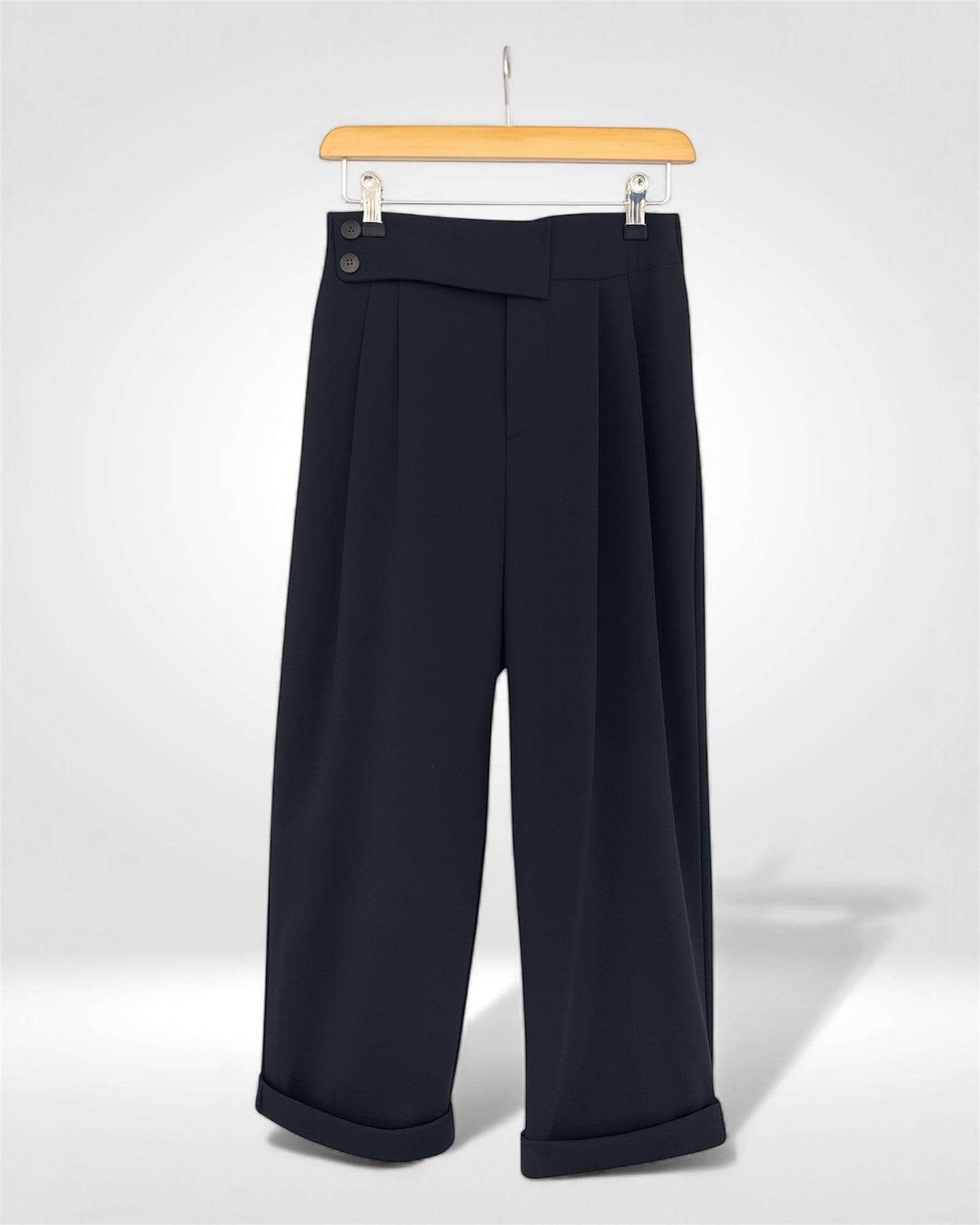 Effortlessly polished and ultra-comfortable, these charcoal pleated crop trousers feature a modern relaxed fit with a soft drape and cuffed hems. The asymmetric waistband detail adds a contemporary twist, making them perfect for both casual styling and elevated everyday looks. Crafted from a smooth, breathable fabric for all-day ease.
