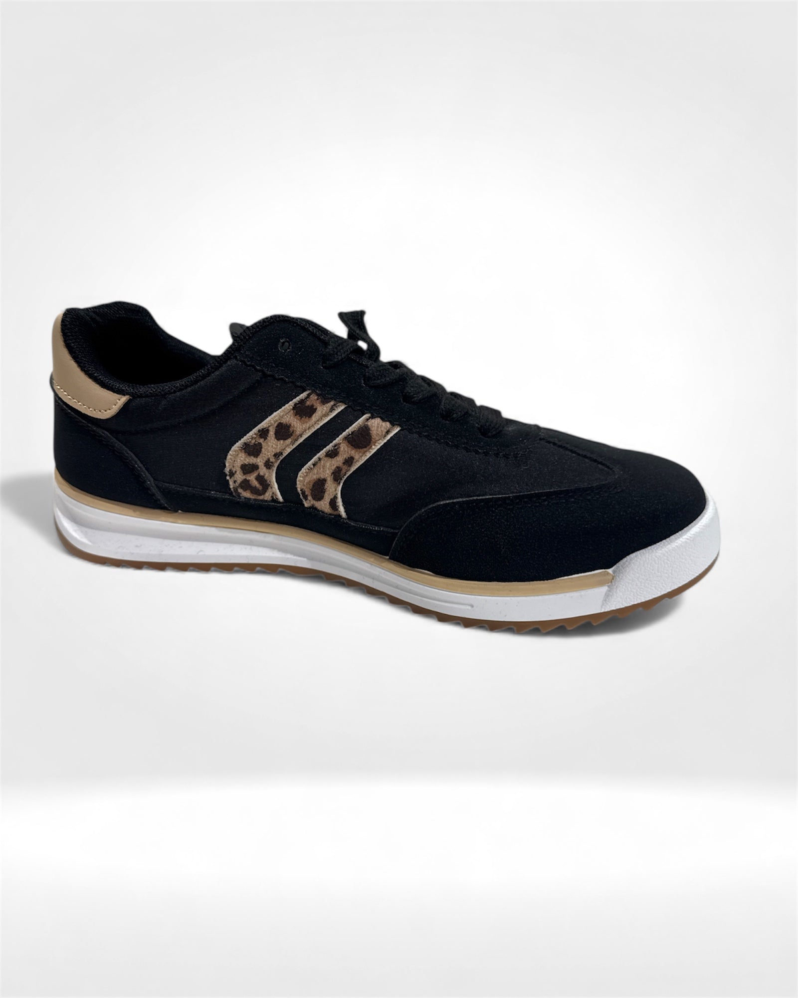 A sleek black sneaker elevated with bold leopard-print side stripes, cushioned comfort, and a sporty rubber sole—perfect for adding a chic, playful edge to everyday outfits.